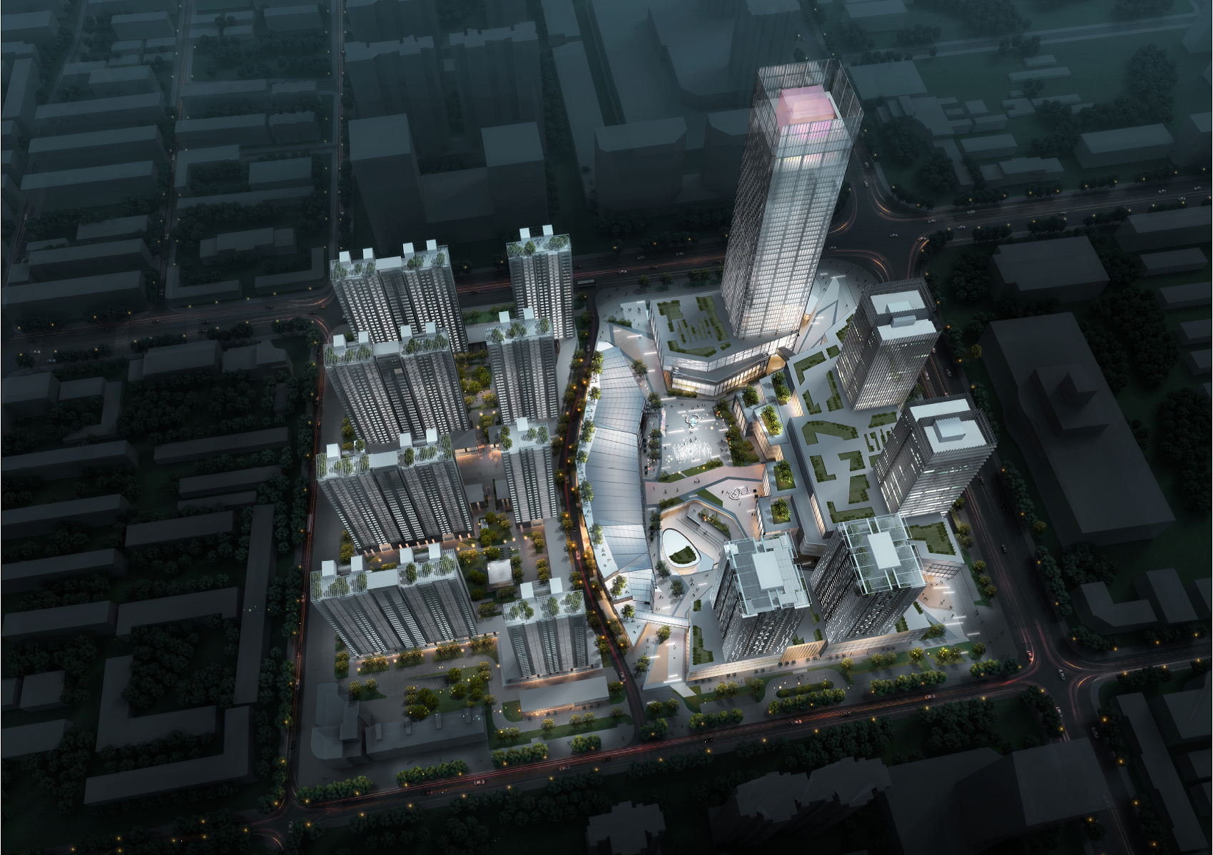 廊坊苏宁广场位于廊坊市区,金光道以南,建国道以北,文明路以东,新华路以西。地块分商业(B1)、商务(B1)用地6.153 公顷,居住用地(R2)4.11 公顷,总用地面积10.263 公顷。 A酒店商业区项目商业(B1)、商务(B1)用地,由1~3#综合楼、4#龙馆商业楼、5#龙珠商业楼5 幢楼及地下工程组成。